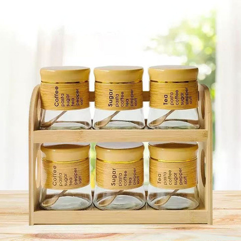 מוצר חדש חם 9 pcs אחסון זכוכית צנצנות עם מדפי במבוק רב תכליתי מתאים לאחסון תבלינים ותבלינים מזון ותבלינים